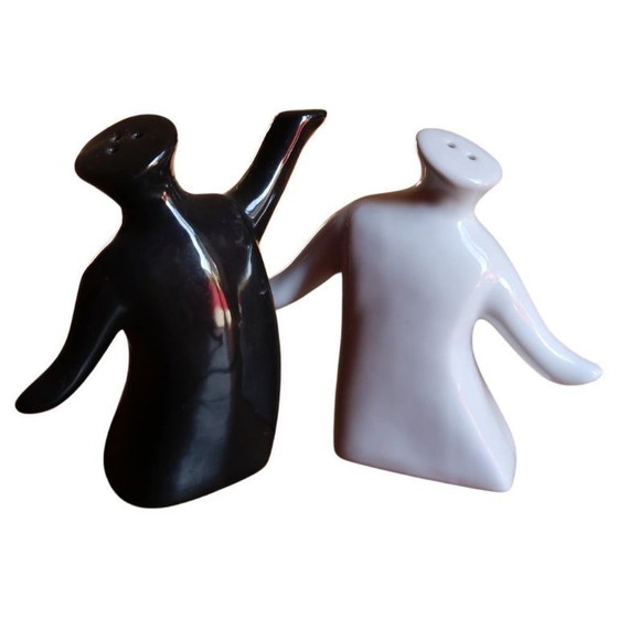 Una coppia di moderne saliere e pepiere in ceramica, dal design stilizzato a forma di figure umane, realizzate con smalti a contrasto in bianco e nero.