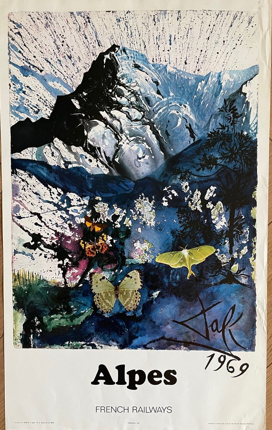 Chemins de Fer Français (Alpes) di Salvador Dalí (1904–1989), stampato in Francia nel 1969. Si prega di notare che su questo poster sono presenti delle pieghe, che aggiungono un tocco di autentico carattere vintage ai pezzi.