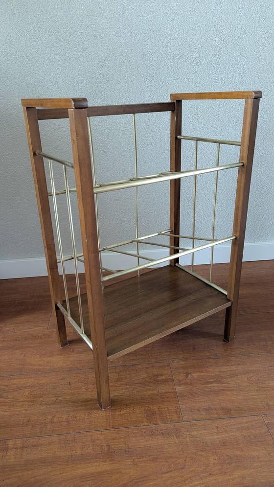 Questo elegante portariviste in stile Art Déco di Reiner Modell presenta un'etichetta con il marchio sul lato inferiore. Il portariviste è realizzato in legno massello scuro e ottone con una splendida combinazione di tonalità marrone e oro. Il design è tipico dello stile Art Déco, con linee pulite e un aspetto raffinato. Perfetto per organizzare riviste e giornali in soggiorno o in ufficio. È in ottime condizioni con minimi segni di usura.