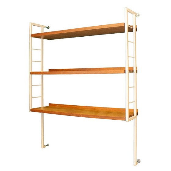 Mensola da parete Mid-Century degli anni '50. Struttura in ferro beige chiaro e 3 ripiani in legno impiallacciato in teak. I ripiani sono semi-modulari; possono essere posizionati a diverse altezze e poi fissati alla parete con 3 viti.