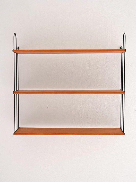 Scaffale da parete "Hylla" del 1960 con ripiani in rovere e struttura in metallo nero. Design scandinavo leggero e funzionale.