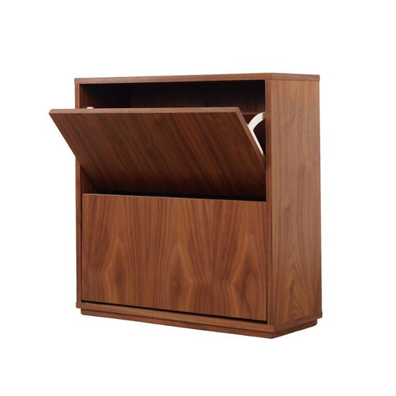 La struttura è in impiallacciatura di noce. Il mobile poggia su una base in legno. La superficie è stata restaurata. All'interno, lo spazio è dotato di due scomparti con ante a cerniera.