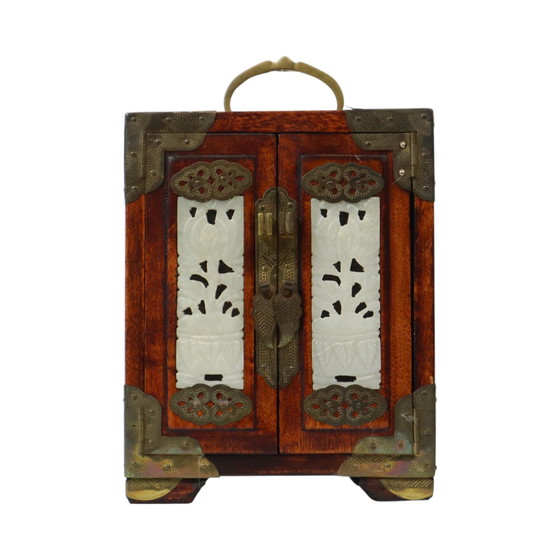 Antico portagioie cinese in palissandro a 2 ante e 3 cassetti, con finiture in ottone e placca in giada al centro delle ante e dei lati, all'interno una fodera rossa con decorazioni floreali in argento, seconda metà del XX secolo, marchiato Shanghai China sul retro.