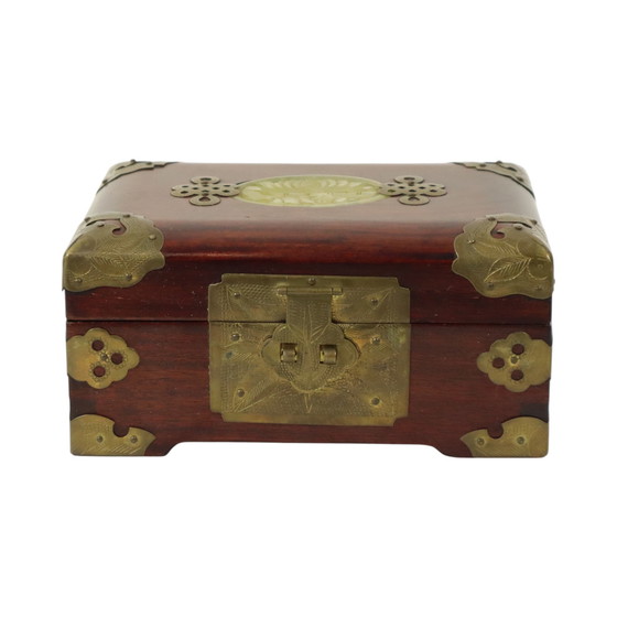 Antico portagioie cinese in legno di palissandro, con finiture in ottone e una placca di giada al centro del coperchio, all'interno una fodera rossa con decorazioni floreali in oro, seconda metà del XX secolo.