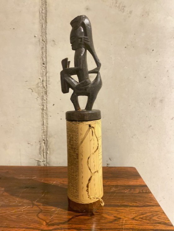 Autentico contenitore per medicinali Batak proveniente dal Nord Sumatra, Indonesia. Questo contenitore cilindrico in bambù veniva tradizionalmente utilizzato da un datu (sciamano) per conservare preparati medicinali e rituali. Il contenitore è sormontato da una figura in legno intagliata a mano e presenta iscrizioni simboliche, tipiche degli oggetti rituali Batak.