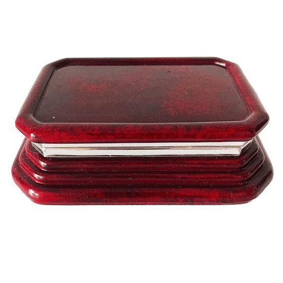 Questa scatola è spesso utilizzata come portagioie da uomo. È realizzata in splendida pelle marmorizzata rossa di alta qualità e ha un coperchio con cerniera placcato oro. Perfetta per la toletta di qualsiasi uomo per riporre gemelli, un orologio, spille da cravatta, monete, ecc. Marchio sul fondo: "Florence Design" (vedi foto). In ottime condizioni.