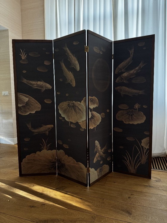 Questo splendido paravento presenta raffigurazioni dipinte a mano di serene carpe koi che nuotano tra ninfee, applicate su una lussuosa carta da parati serigrafata Fromental. Il paravento stesso è realizzato su misura, mentre la carta da parati è di Fromental, rinomata per la sua eccezionale qualità e artigianalità, rendendo questo pezzo un'aggiunta davvero esclusiva a qualsiasi interno. Questa combinazione crea un effetto visivamente accattivante e strutturato, emanando un'atmosfera di tranquillità e bellezza naturale. Il retro è decorato con un motivo intrecciato testurizzato per un'estetica contrastante ma complementare.