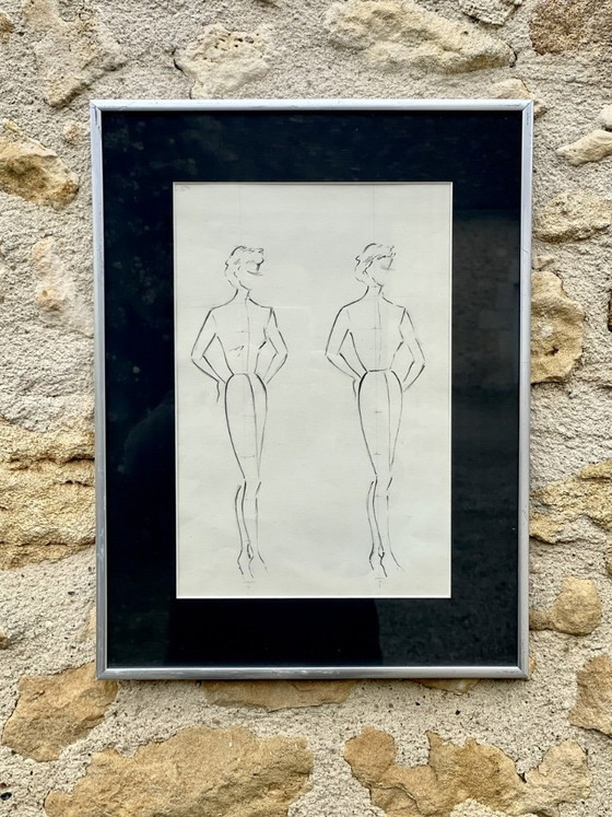 Schizzo/illustrazione/disegno di moda vintage, firmato e incorniciato, risalente agli anni '50 circa. L'opera presenta un elegante disegno di moda, realizzato a matita, con due silhouette femminili, tipiche dell'epoca. È firmato dall'artista di moda francese Berthe Duquaine e datato "30 Janvier 1951" (30/01/1951) sul retro del disegno (vedi foto). L'opera è in ottime condizioni generali, originale e vintage, essendo stata ben conservata. Presenta lievi segni del tempo sulla carta, commisurati all'età. Nessuno strappo o lacerazione (vedi foto). È incorniciato da un passepartout nero con bordi bianchi smussati, dietro un vetro pulito all'interno della cornice, che non presenta crepe o scheggiature (vedi foto). La cornice in metallo spazzolato presenta alcuni lievi segni del tempo e dell'usura, nonché una patina dovuta al tempo, sulla parte anteriore, sui lati, sui bordi e sul retro, che ne accresce il fascino (vedi foto). Sul retro della cornice è presente un gancio per appenderla facilmente alla parete (vedi foto). Tutte le foto sono state scattate con luce naturale, pertanto i colori possono variare a seconda della luminosità, dei riflessi, degli angoli e della prospettiva di visualizzazione. DIMENSIONI: Altezza: 18,7 cm Larghezza: 13 cm Profondità: 1,5 cm