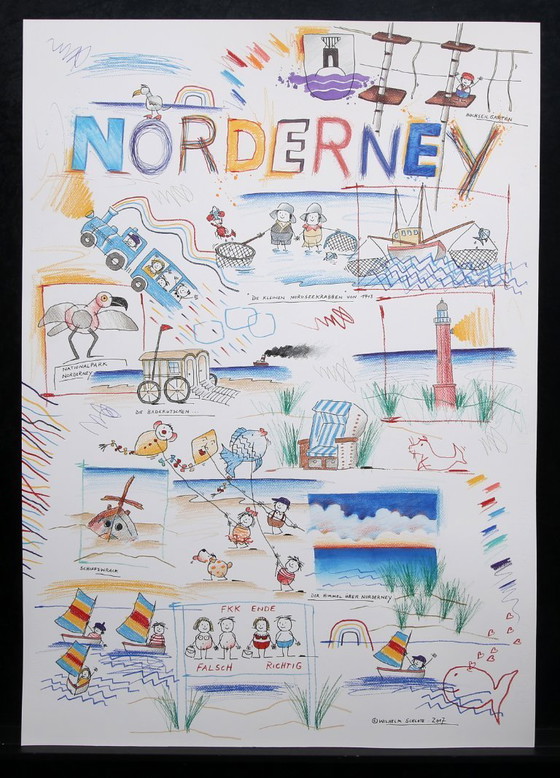 Immergiti nel vivace mondo di Wilhelm Schlote con questo disegno originale per il poster della città di Norderney. Creato con matita colorata e inchiostro su carta vergata Fabriano di alta qualità, quest'opera cattura l'essenza della città costiera con elementi giocosi e colorati. Un pezzo unico firmato e datato del 2017, che sarà un'aggiunta sorprendente a qualsiasi stanza.