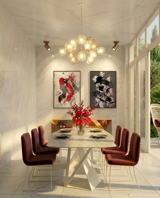 Il dittico del Maestro gioca sul contrasto tra espansione e struttura. Sinistra (Esplosione Vitale): Domina un dinamismo centrifugo e solare. Il rosso protagonista e gli schizzi leggeri su fondo grigio creano un'opera aerea che illumina l'ambiente con energia e ottimismo. Destra (Collisione Materica): Ha un carattere centripeto e architettonico. Il nero prevale, creando una stratificazione profonda (tecnica delle "impronte") che dona all'insieme rigore, eleganza e stabilità visiva. In sintesi: la prima opera accende lo spazio, la seconda lo ancora con autorità.