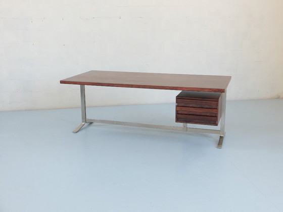 Scrivania a piedistallo, disegnata da Gianni Moscatelli per Formanova Italia, tre cassetti, gambe in acciaio inox, piano in palissandro Rio, scrivania completamente smontabile, serratura originale senza chiave, rari segni d'uso, prodotto selezionato dal team STAND, showroom a Uzès, Gard, Francia, consegna da parte nostra su richiesta.