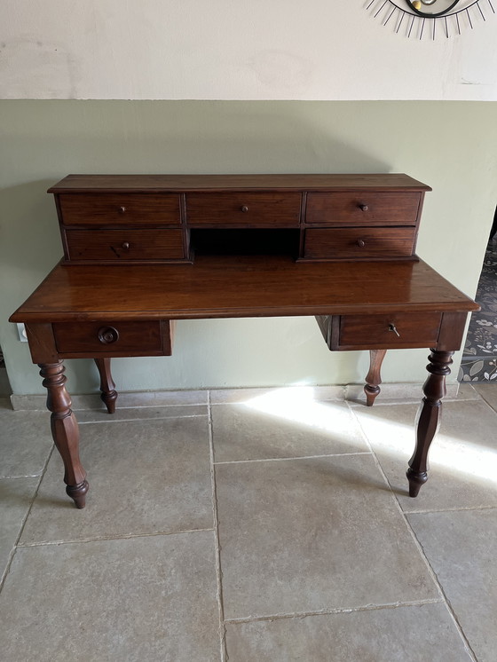 Scopri il fascino di questa elegante scrivania a gradini in noce, realizzata da un abile ebanista. Dotata di ampio spazio di archiviazione con cinque cassetti a gradini e una nicchia centrale, include anche due ampi cassetti a scomparti, uno con chiave. Le gambe affusolate aggiungono un tocco di raffinatezza. La superficie e il piano della scrivania mostrano segni del tempo, aggiungendo carattere al suo aspetto. Il legno è stato trattato e nutrito, garantendone la durevolezza.
