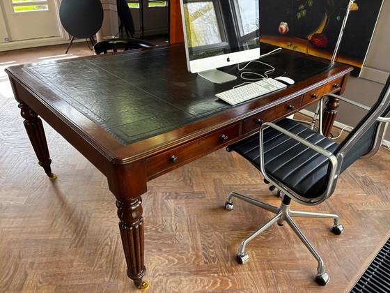 Scrivania inglese antica, circa 1880, in mogano con intarsi in pelle nera, con 6 cassetti, poggiante su rotelle in ottone. Il piano è leggermente incurvato (vedi foto).