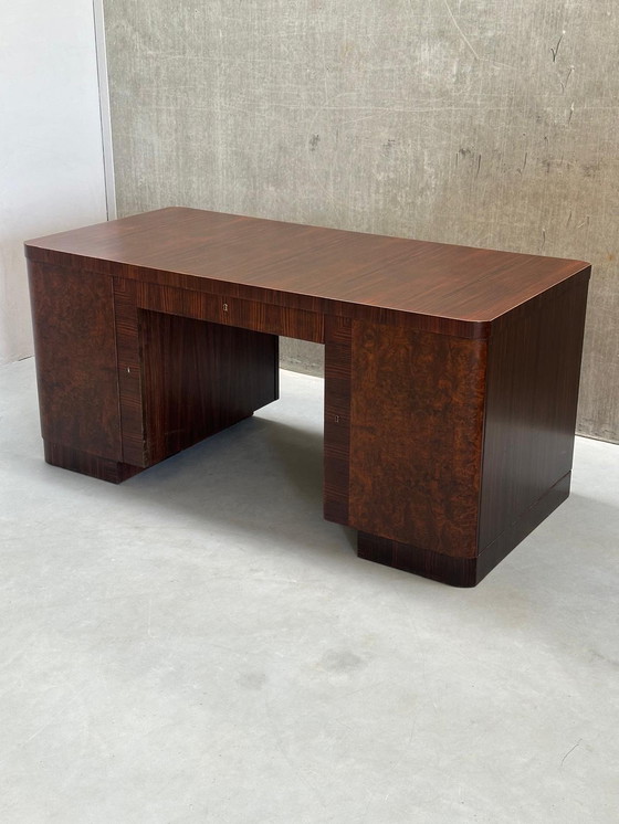 Splendida scrivania Art Déco, un vero pezzo forte realizzato in pregiato ebano di Macassar. La scrivania è un'opera originale del rinomato maestro tedesco dell'Art Déco Bruno Paul per Deutsche Werkstätten Hellerau. Le sue dimensioni sono H77 x L165 x P80 cm. Essendo bifacciale, può essere collocata anche al centro della stanza. La distanza tra i lati è di 68 cm.