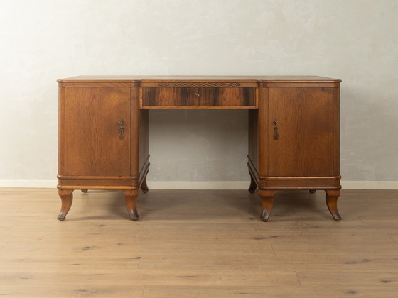 Elegante scrivania Art Déco con gambe dalla forma sinuosa. Una raffinata fascia decorativa sopra il cassetto centrale ne sottolinea la cura dei dettagli. Realizzata in legno massello di tonalità marrone medio-scura, la scrivania emana un'atmosfera calda e accogliente. Due ante con serratura, dietro le quali si trovano tre cassetti in rovere tinto e un ripiano estraibile, insieme all'ampio cassetto centrale, testimoniano la pregevole fattura. La scrivania, accuratamente restaurata, si presenta in ottime condizioni vintage.