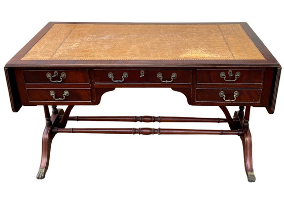 Scopri l'eleganza senza tempo di questa scrivania inglese bifacciale in mogano, completa di prolunghe per una maggiore funzionalità. Questo pezzo classico, con il suo piano in pelle finemente lavorato, evoca un'epoca in cui artigianato e stile erano inseparabili.
