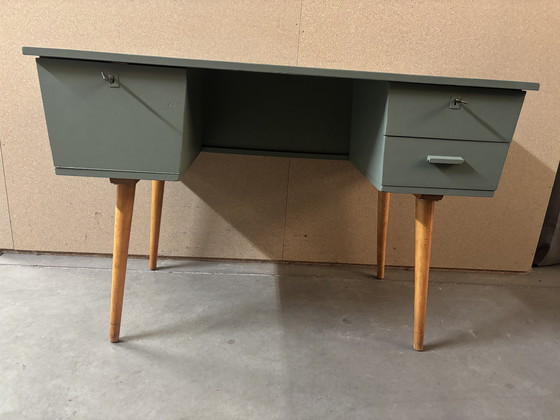 Questa scrivania vintage emana un fascino senza tempo, perfetta per aggiungere un tocco di eleganza a qualsiasi studio o ufficio. La sua finitura verde tenue si abbina perfettamente alle tonalità naturali del legno delle gambe, creando un armonioso mix di colori e texture.