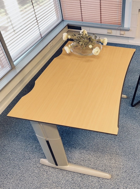 Scrivania in faggio, sedia in pelle con ruote e base a rulli