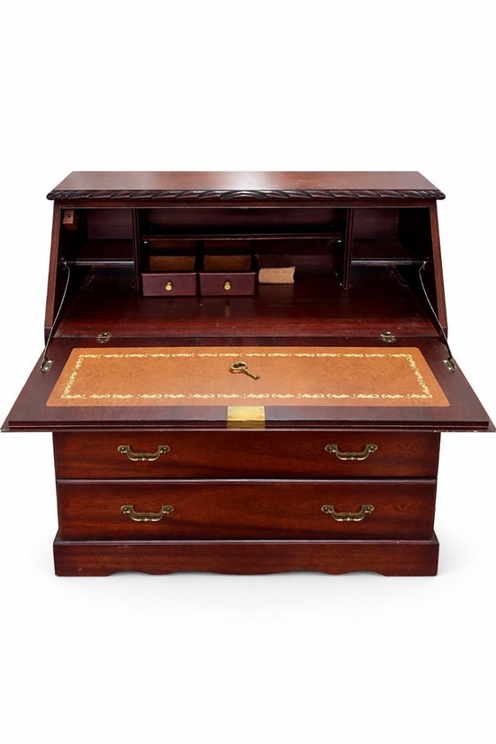 Una scrivania in mogano dalle proporzioni armoniose, con ante a ribalta, che offre sia spazio contenitivo che una pratica superficie di scrittura, ideale per piccoli uffici domestici o soggiorni.