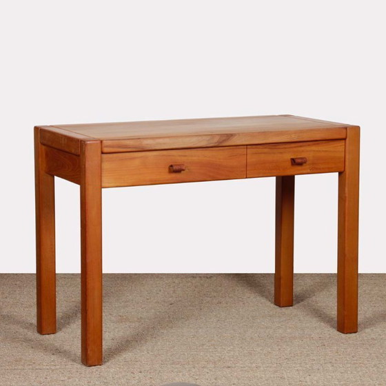 Scrivania vintage in olmo massiccio, prodotta in Francia dalla Maison Regain negli anni Settanta. Presenta una bella patina originale e si distingue per le sue linee pulite e il suo design senza tempo. La scrivania è dotata di due cassetti funzionali, ciascuno dei quali è ornato da maniglie in pelle che aggiungono un tocco caldo e autentico. Questo pezzo è in buone condizioni originali, con leggere tracce di usura coerenti con la sua età, che ne evidenziano il fascino vintage.