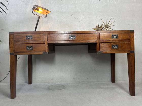 Scrivania di alta qualità dal design minimalista. Design elegante e funzionale con fronzoli ridotti al minimo. Dettagli in ottone caratteristici dei mobili in stile "campaign". In rovere. Può essere utilizzata anche come scrivania indipendente (retro splendidamente rifinito). 5 cassetti. In ottime condizioni. Altezza: 78 cm. Larghezza: 143,5 cm. Profondità: 55 cm. Distanza tra i cassetti: 57 cm.