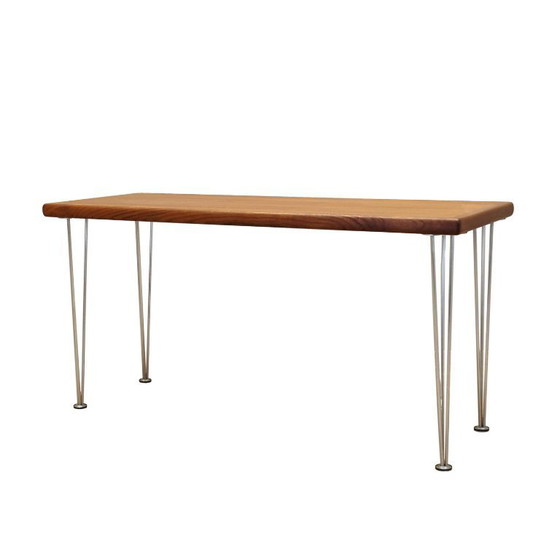 Il piano è rivestito in teak impiallacciato. Le gambe sono state sostituite con gambe nuove in metallo.