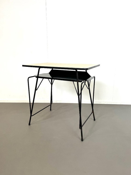 Struttura in acciaio massiccio nero con piano in legno rivestito in Formica.