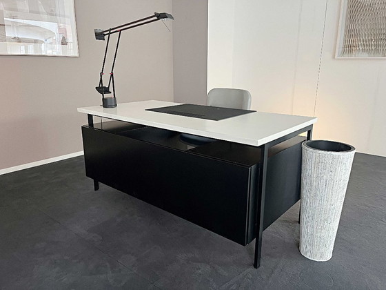 Struttura in acciaio laccato nero, corpo con cassetti e ripiani estraibili in rovere laccato nero a poro aperto, piano in laminato bianco lucido. Condizioni discrete, con segni di usura e graffi dovuti all'età.