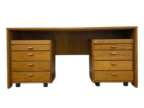 Questa spaziosa e pratica scrivania retrò è stata prodotta in Cecoslovacchia negli anni '80. Presenta un design pulito e funzionale tipico dell'epoca, con una superficie impiallacciata che presenta una piacevole trama in legno naturale. La scrivania è realizzata con una struttura semplice e solida e include due cassetti mobili su ruote, che offrono spazio di archiviazione flessibile e un utilizzo quotidiano.