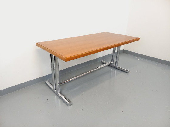 Scrivania vintage anni '70, disegnata nello stile di Gordon Russell o Jules Wabbes, piano rettangolare in noce, base tubolare in metallo cromato, adatta come centrotavola, ottime condizioni generali.