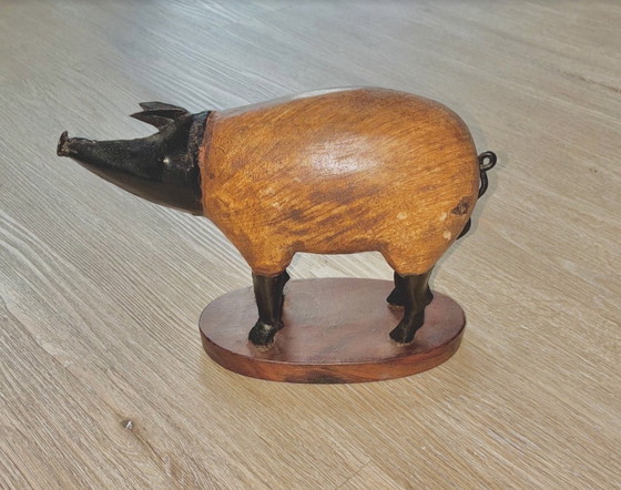 Offro in vendita una scultura di maiale in legno e ferro. Il corpo e la base sono in legno. La testa, le zampe e la coda arricciata sono in ferro. Le dimensioni sono: Lunghezza × Larghezza (misurata alla base) x Altezza 26 x 9,5 x 20 cm. La scultura si è scurita con il tempo.