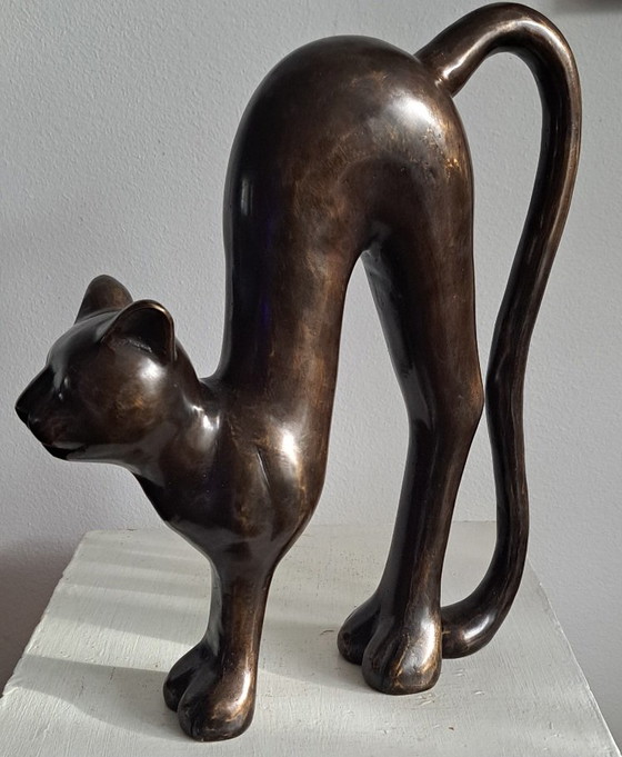 Scultura in bronzo di un gatto con la schiena alta