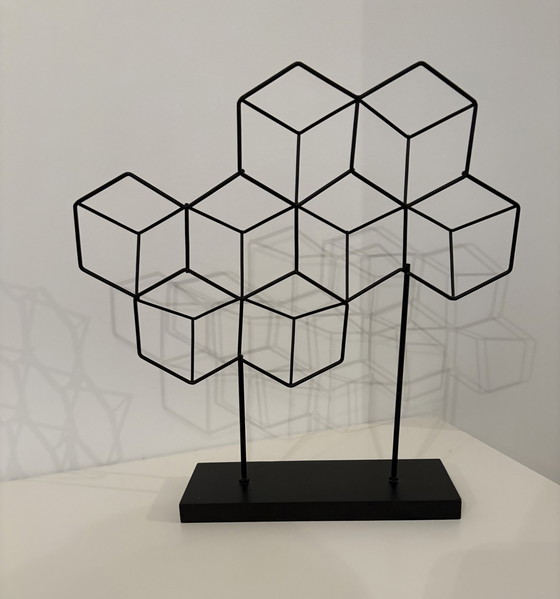 Moderna scultura in filo metallico nero su base in legno nero. Crea un effetto ombra unico sulla parete di fondo. Dimensioni: 30 x 30 x 7 cm.