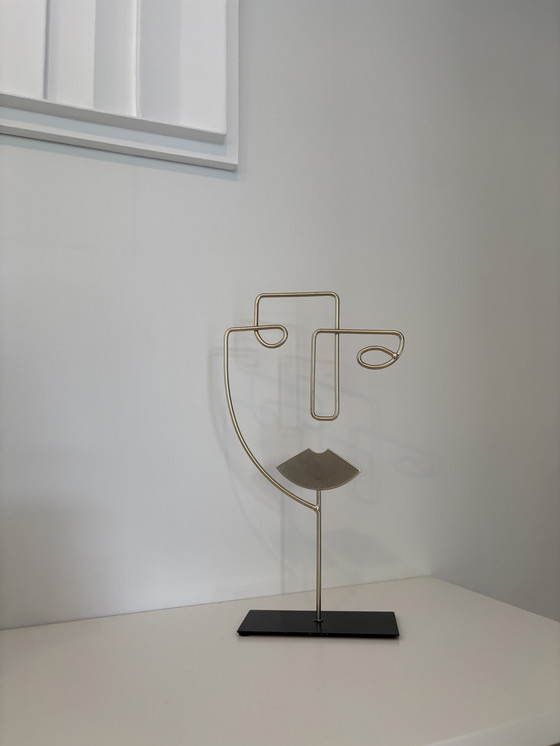 Moderna scultura in filo metallico raffigurante un volto stilizzato in raffinato ottone dorato. Con la giusta illuminazione, questa scultura crea uno straordinario gioco di linee sulla parete di fondo.