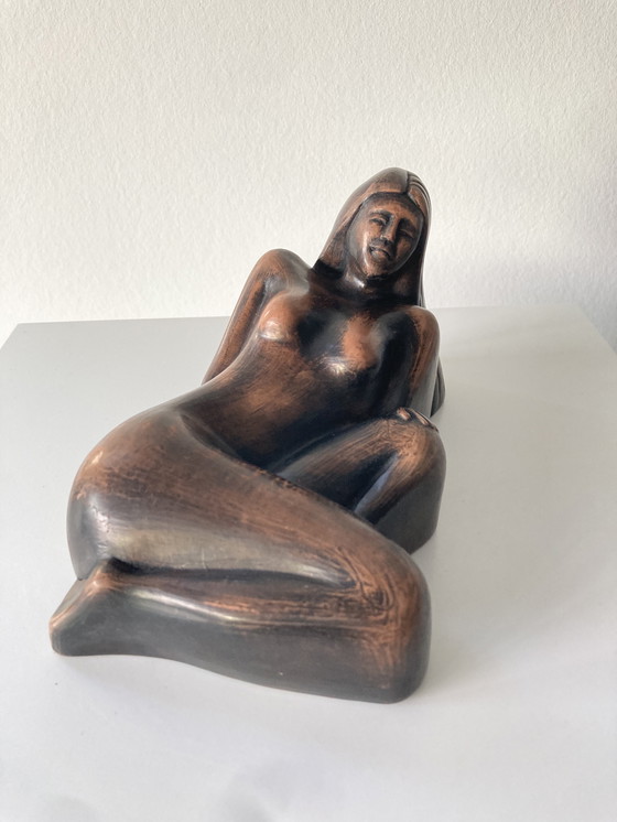 Scultura in ceramica della metà del secolo scorso raffigurante una donna sdraiata, dai dettagli molto delicati. Si tratta di una scultura in ceramica a colata cava di argilla lavata con patina color bronzo. Il volto e i capelli, in particolare, sono lavorati con grande precisione.