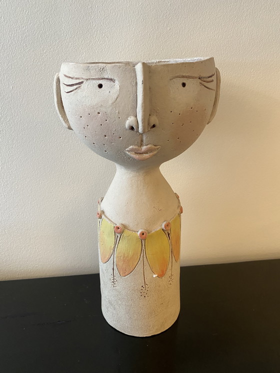Scultura vegetale vintage realizzata a mano. A forma di volto e busto. Progettata per contenere piante. Stile astratto e naif. L'interno della ciotola a forma di volto è smaltato e presenta piccoli fori di drenaggio. Si tratta di un pezzo fatto a mano con splendide finiture. In perfette condizioni impeccabili. Altezza 32 cm, larghezza 16 cm. Non firmata. Ulteriori foto o informazioni disponibili su richiesta.