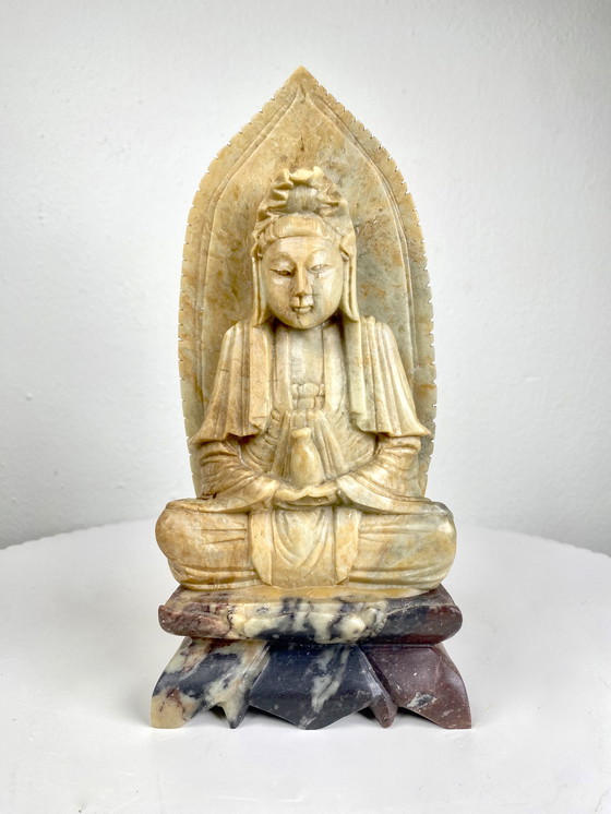 Bellissima statuetta vintage di Buddha seduto di medie/piccole dimensioni, realizzata in pietra beige (probabilmente pietra ollare) in moderno stile bohémien. Un regalo perfetto per l'arredamento vintage della casa, perfetto per ogni anima spirituale! Altezza: 20 cm / 7,8 pollici (base) Larghezza: 9,5 cm / 3,7 pollici (base) Profondità: 4,5 cm / 1,7 pollici Peso: 971 grammi