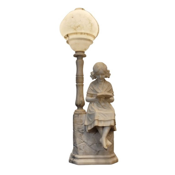Scultura/Lampada da tavolo "Ragazza che legge", Alabastro, Firmata, Art Nouveau, Inizio XX secolo - Italia