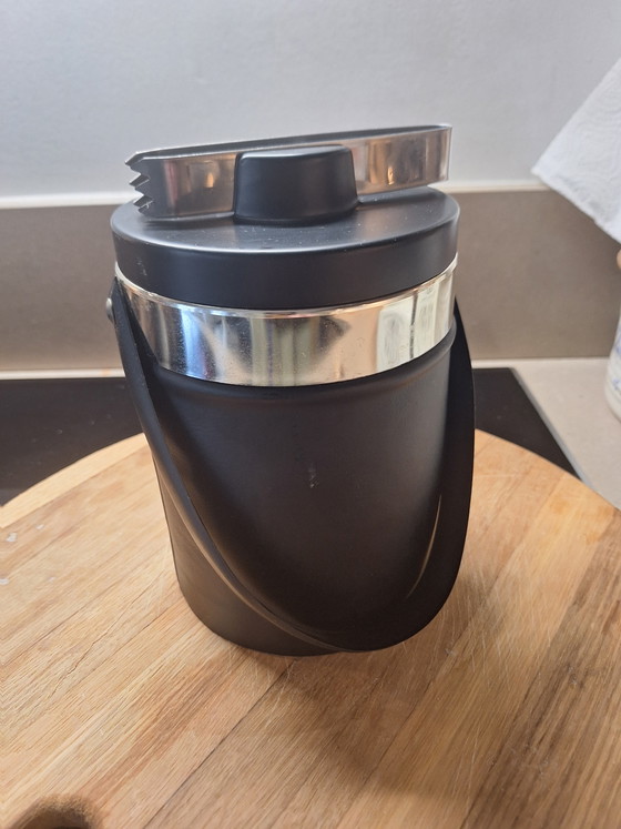 Questo secchiello per il ghiaccio anni '70 aggiunge un tocco di fascino retrò a qualsiasi occasione. Con la sua elegante finitura nera e argento, è un accessorio di stile per il bar.
