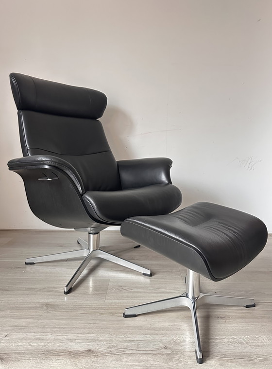 Poltrona di design Conform, modello Time Out, realizzata in pelle nera con scocca in legno nero. La poltrona torna automaticamente nella posizione originale ed è molto comoda da usare.