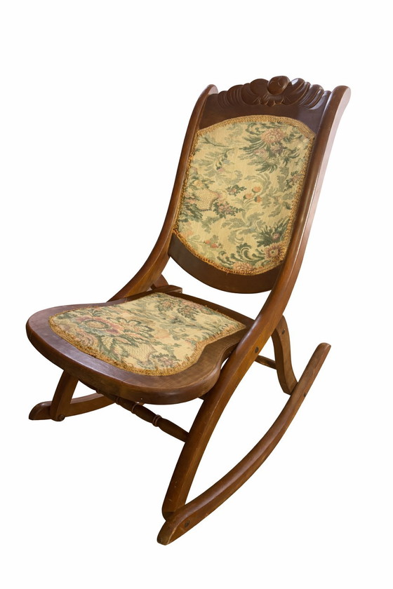 Sedia a dondolo in legno vittoriana della fine del XIX secolo con rivestimento floreale originale.