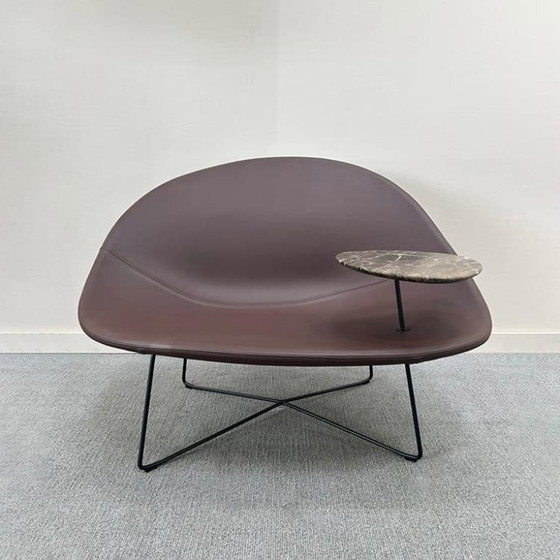 Elegante poltrona a secchiello Sergio Tacchini in similpelle marrone, con base a slitta a croce e un tavolino laterale compatto integrato, perfetto per un laptop o per appunti. Una combinazione di comfort, design e funzionalità, ideale per lounge, sale d'attesa o uffici moderni.