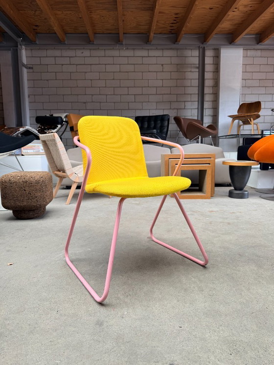 La poltrona Cobra di Adolfo Abejón è un pezzo d'arredamento di grande impatto che illumina qualsiasi ambiente con i suoi colori vivaci e il design moderno. Questa poltrona combina una seduta giallo acceso con una struttura in metallo rosa giocosa, creando un look unico e contemporaneo.
