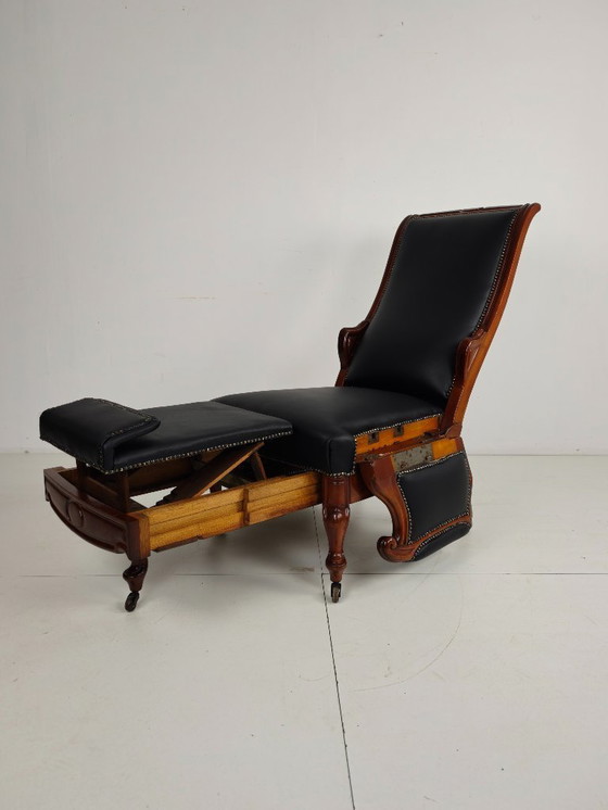 Una splendida e rara sedia da biblioteca regolabile del XIX secolo di Horrix, rivestita in pelle nera e rifinita con chiodi decorativi in ottone. La sedia può essere regolata in diverse posizioni ed è marchiata "Horrix" sul lato inferiore.