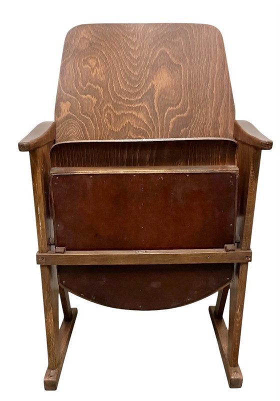 Questa poltrona da cinema (teatro) è stata prodotta da Ton (ex Thonet) in Cecoslovacchia negli anni '60. La sedia è stabile e può essere posizionata ovunque. È realizzata in legno di faggio, legno curvato e compensato impiallacciato. La seduta è ribaltabile verso l'alto. Il peso della seduta è di 10 kg.