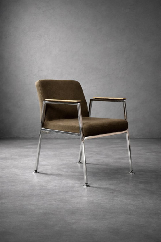Questa sedia da conferenza è stata realizzata dal produttore tedesco Drabert negli anni '70. Secondo il timbro, è stata prodotta nel 1977. La solida struttura cromata conferisce alla sedia un aspetto leggero e un carattere moderno, garantendo al contempo durata e stabilità. La seduta e lo schienale sono rivestiti in un tessuto originale in un'elegante e profonda tonalità di marrone che, abbinato al legno di rovere naturale dei braccioli, crea un insieme coerente e senza tempo. Questa sedia esemplifica lo stile Mid-Century Modern con chiare influenze Bauhaus, combinando funzionalità, eleganza e semplicità in una forma senza tempo. Ogni gamba termina con un piede dal profilo elegante, che completa l'estetica del mobile, proteggendo il pavimento e garantendo stabilità. Questa sedia è perfetta non solo per uffici o sale conferenze, ma anche per uffici domestici, soggiorni o sale d'attesa. Ovunque comfort, design e qualità siano di primaria importanza.