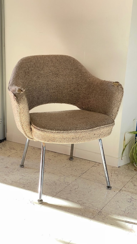 Superba sedia da conferenza Eero Saarinen, prodotta dalla leggendaria Knoll House, una meraviglia del design anni '70, completamente originale, che necessita di restauro sui due braccioli o meno. Una poltrona in lana e acciaio cromato, dal design senza tempo, dal comfort ineguagliabile e dallo stile unico, proprio come Knoll. Ottime condizioni, solo i due braccioli necessitano di restauro da parte di un tappezziere (o di un artigiano). Schiume in ottime condizioni, una gamba con cromatura patinata, pulitissima. Un vero pezzo da collezione per la vita di tutti i giorni! L: 69 cm – A: 76 cm – P: 62 cm – A: 45 cm – 12 kg – Spedizione tramite Colissimo svitando le gambe.