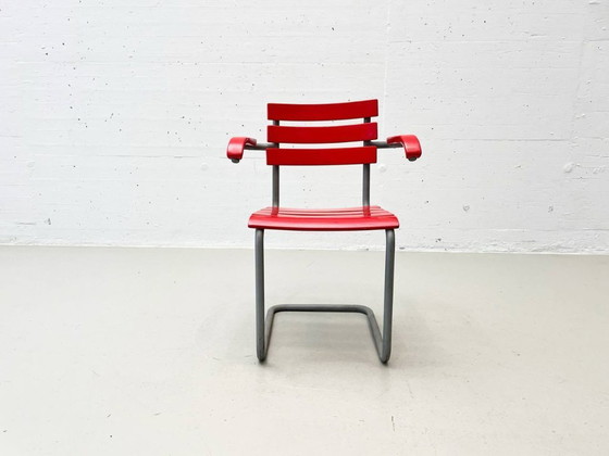 Condizioni: La sedia è in buone condizioni, usata ma con un'autentica patina. Le doghe di legno rosso presentano piccole scheggiature e graffi, in particolare sui braccioli. La struttura in tubi d'acciaio è integra ma mostra segni del tempo. Nel complesso, un classico funzionale e ben conservato del design svizzero.