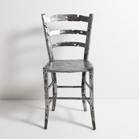 Sedia modello “campagnola” in ferro, successivamente traforata. Dettagli: Colore: ferro Materiali: ferro Dimensioni: l40Xp40Xh85 cm - seduta h46 cm Peso: 10 kg. Adatto per: solo uso interno