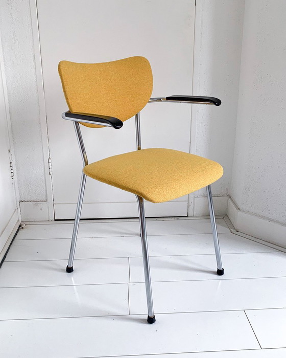 Rivestita di nuovo e in ottime condizioni. Presenta un resistente tessuto di rivestimento color senape/giallo. Base cromata e braccioli sintetici. Tutto in buono stato.